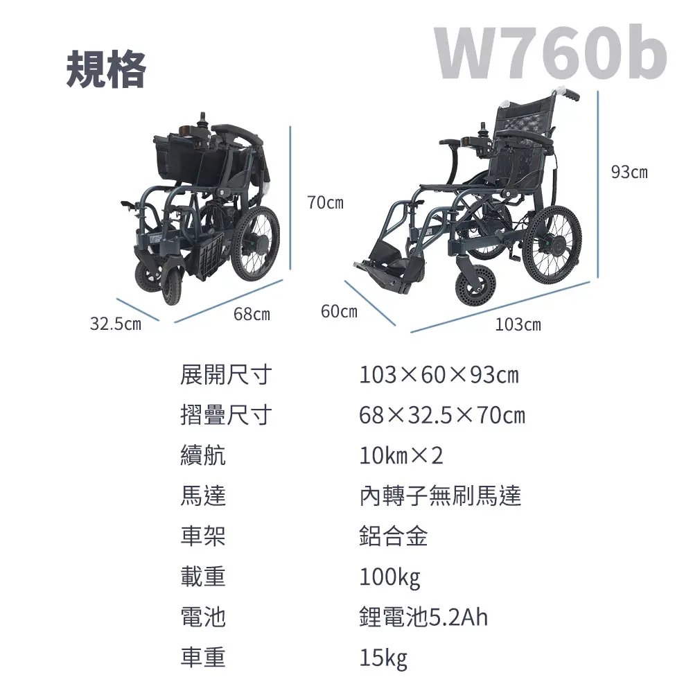 輕量摺疊電動輪椅 W760B(輕鬆折疊/ 日本技術馬達/ 快拆鋰電池/ 出國首選)